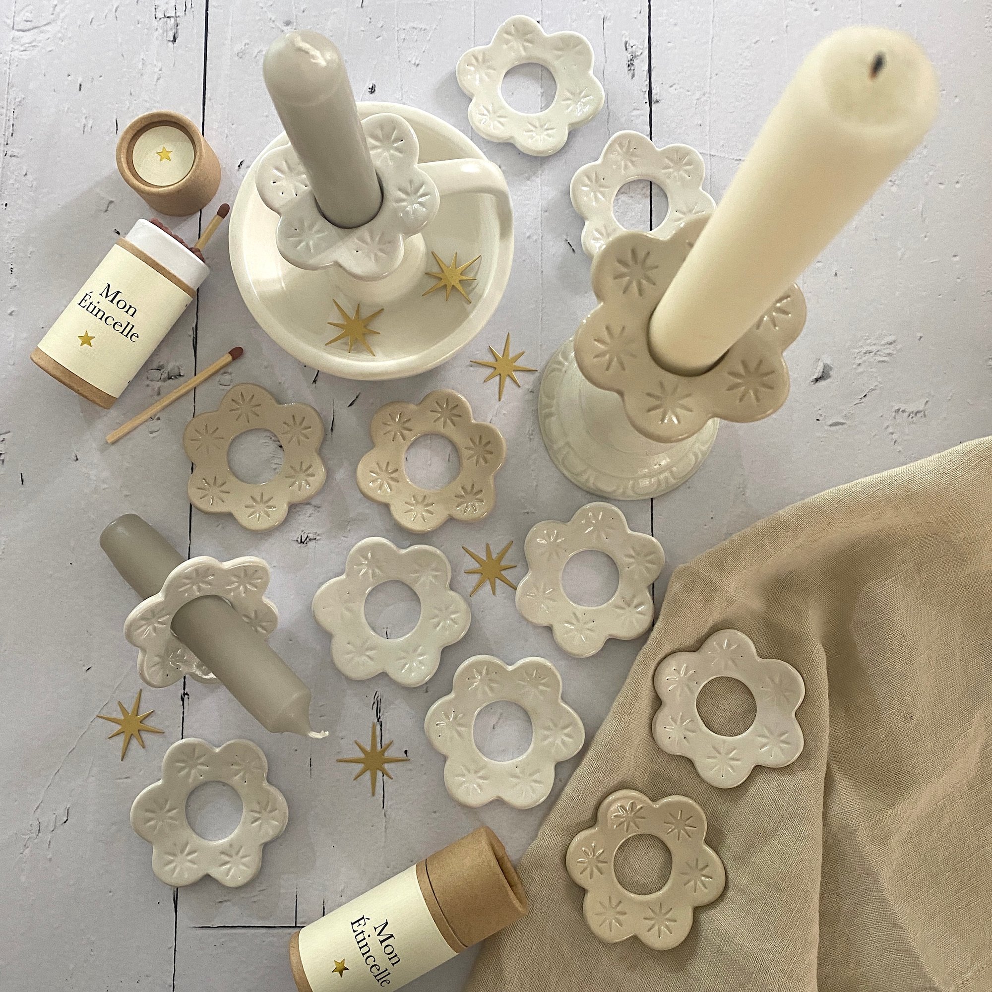 Petite fleur en céramique à poser sur le haut de vos chandeliers et destinée à recueillir la cire qui coule.