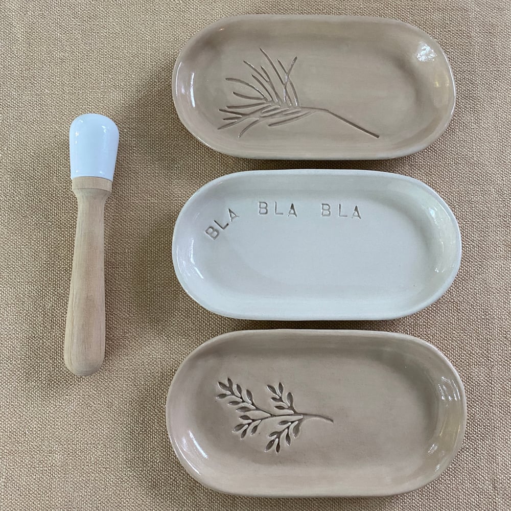 Petite coupelle creuse de forme allongée, motif feuillage ou écriture Bla Bla Bla...