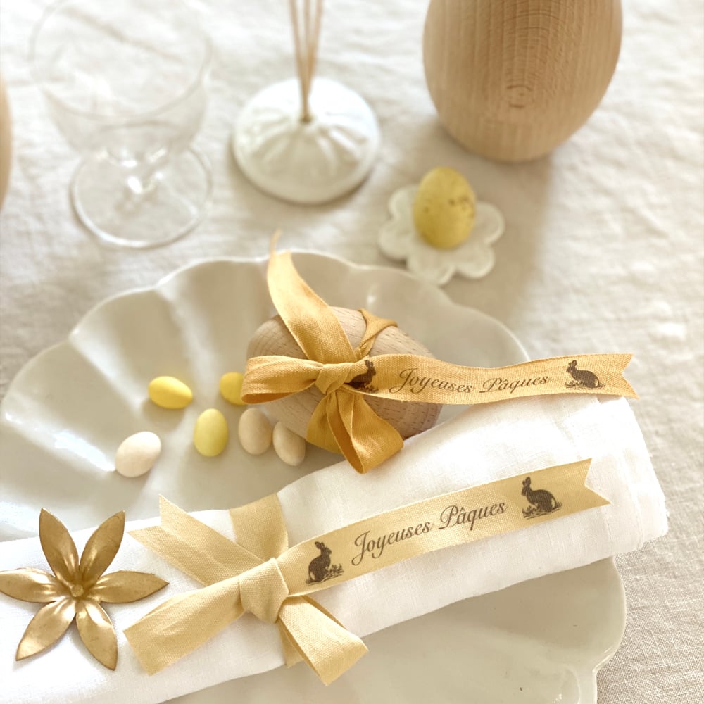 Ruban "Joyeuses Pâques" entouré de lapins ou de cloches pour enrubanner vos paniers pour la chasse aux œufs, à nouer à vos serviettes de tables, vos vases, vos bougeoirs...
