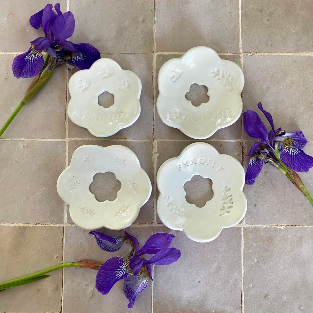 Petite coupelle creuse en forme de fleur en grès, ouverture fleur au centre plus ou moins grande selon si on souhaite placer une fleur ou faire pousser un noyau d'avocat